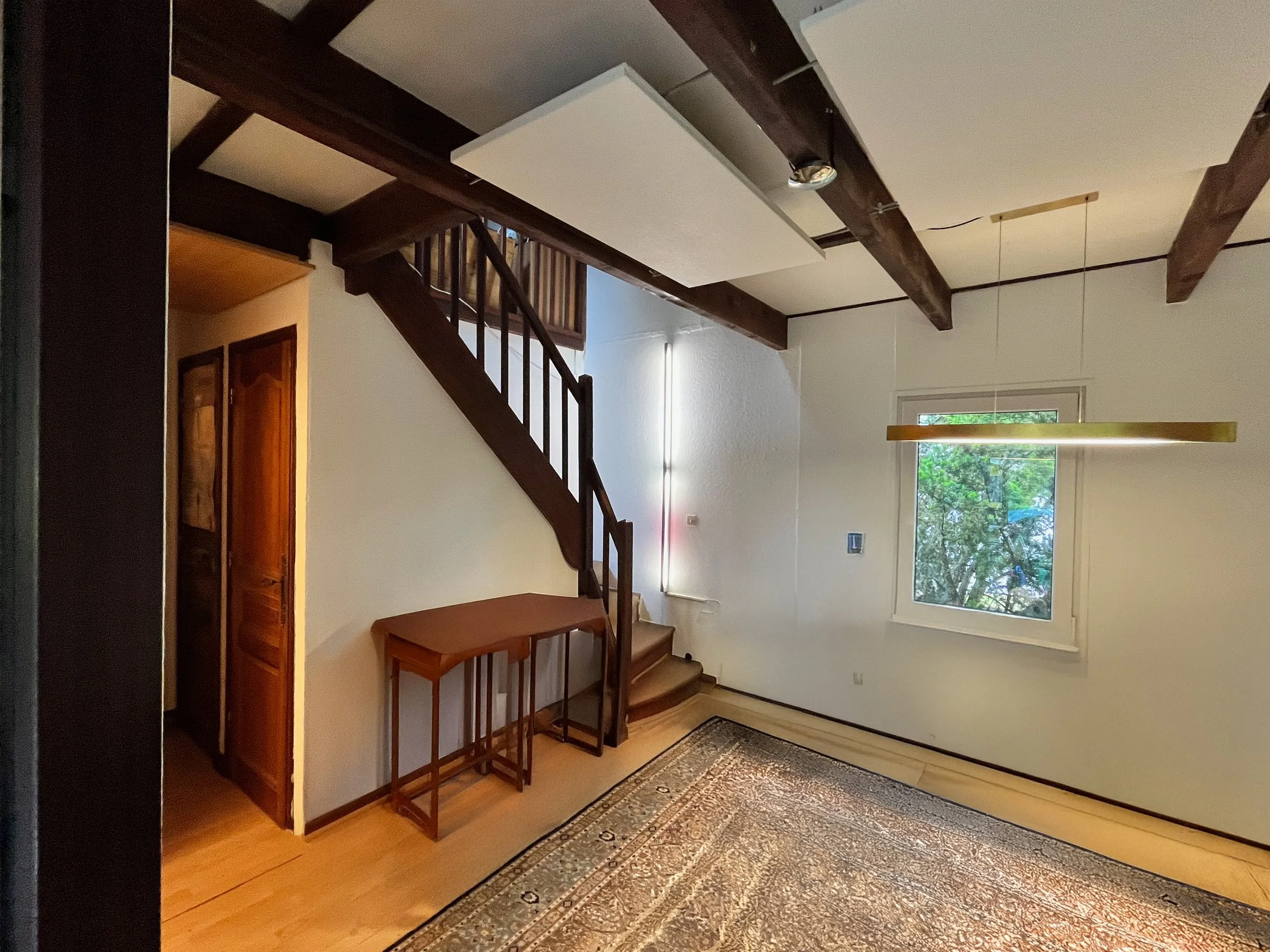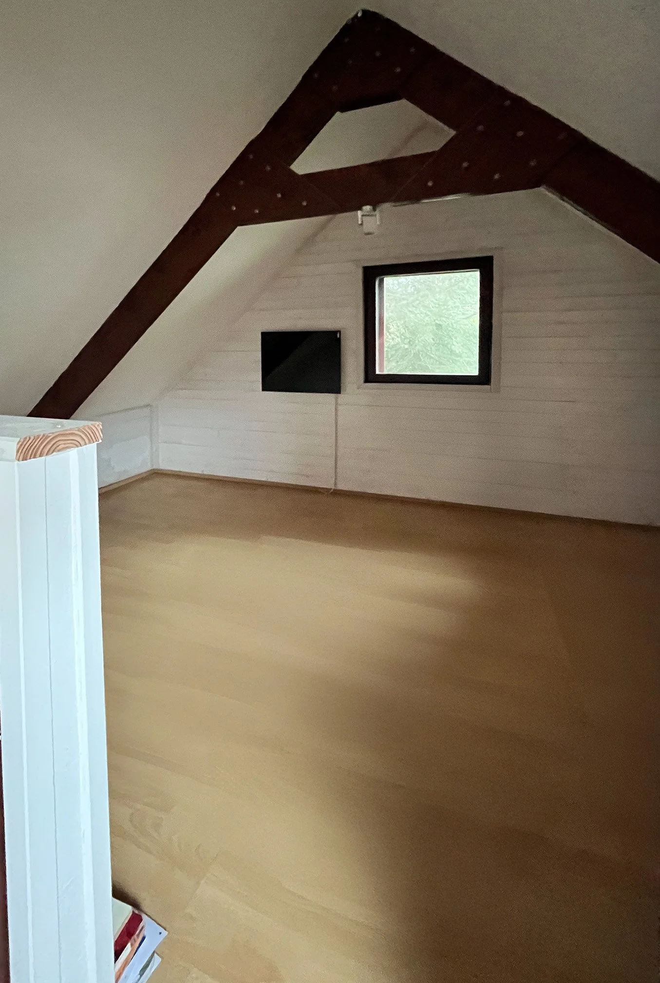 • Großer, offener Schlafraum im Obergeschoss mit charmanten Dachschrägen und Holzbalken – ein Ort zum Entspannen und Wohlfühlen.